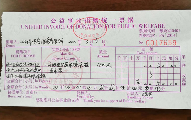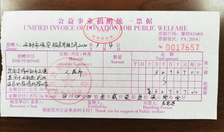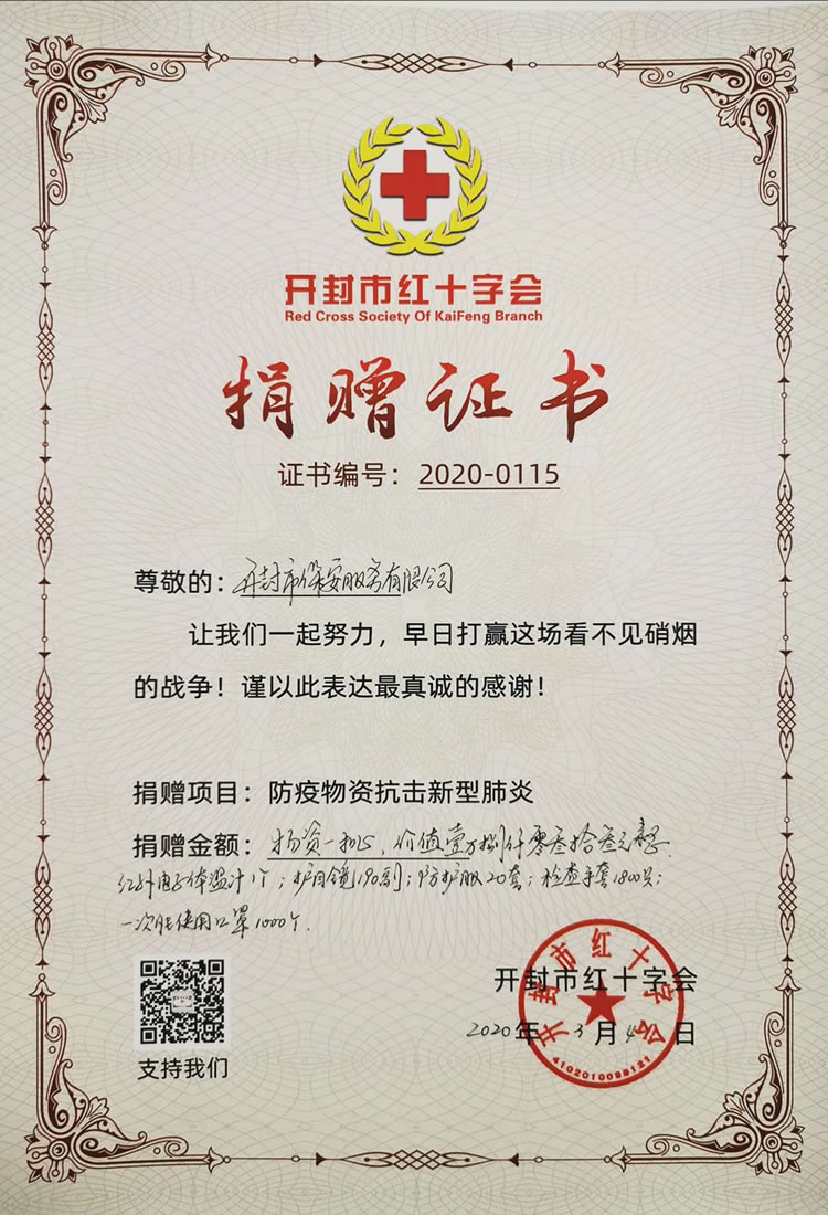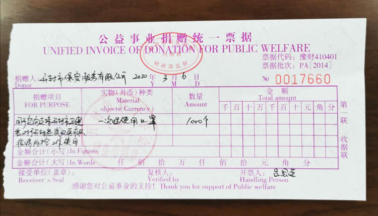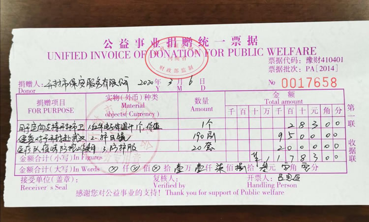 2020年3月2日,公司發(fā)起了新型冠狀病毒疫情防控募捐倡議書(shū),倡議全體人員捐款、捐物支援疫情嚴(yán)重地區(qū),助力武漢抗擊疫情。全體員工積極響應(yīng),紛紛捐款,僅一天時(shí)間就籌集善款32737元。公司孫國(guó)杰總經(jīng)理在抗疫物資緊缺的情況下,多方聯(lián)系外地的廠家,購(gòu)買(mǎi)防疫物資,此次公司向開(kāi)封市紅十字會(huì)捐贈(zèng)抗疫物品一批,價(jià)值18033元:醫(yī)用一次性口罩1000個(gè)、護(hù)目鏡190個(gè)、防護(hù)服20套、醫(yī)用一次性手套1800只、電子體溫計(jì)1個(gè)。并及時(shí)通過(guò)河南省保安協(xié)會(huì)聯(lián)系疫情嚴(yán)重地區(qū)(湖北省保安協(xié)會(huì)),向?yàn)?zāi)區(qū)保安員表示慰問(wèn)。