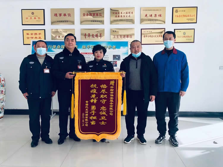 2020年,我公司駐奇瑞汽車河南有限公司保安員,他們辛勤的工作,努力的付出,得到了奇瑞公司領(lǐng)導(dǎo)的充分肯定,特向公司送錦旗一面,實(shí)現(xiàn)了2021年公司開門紅。希望全體員工以他們?yōu)榘駱?,不斷提高文明服?wù)水平,為公司發(fā)展做出更大貢獻(xiàn)!